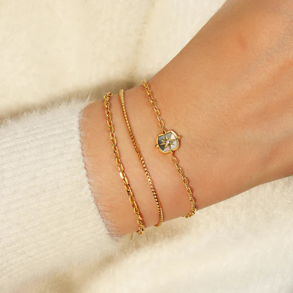 Embrace the latest dark aesthetic trend with this edgy bracelet. Featuring an eight-pointed star set on a mother-of-pearl base, it adds a bold and unique touch. Stack it with other pieces to create a look that's uniquely yours and sets the fashion pace.