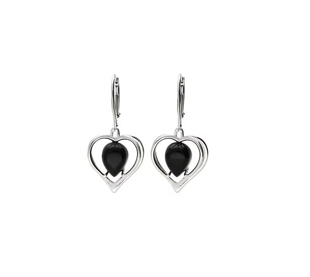 Designer earrings made of sterling silver with pear shaped onyx stones.