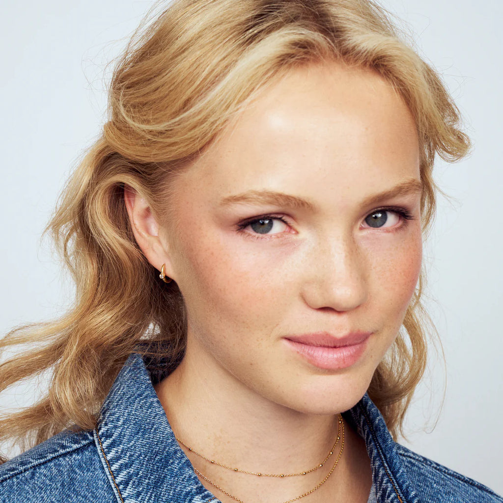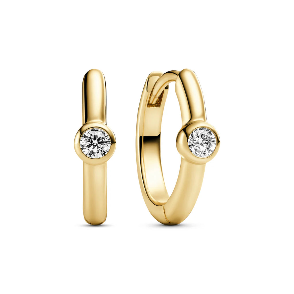 Earrings made of 18 karat gold plated 925 Sterling Silver, a polished surface, and handset with facet cut white zirconia.