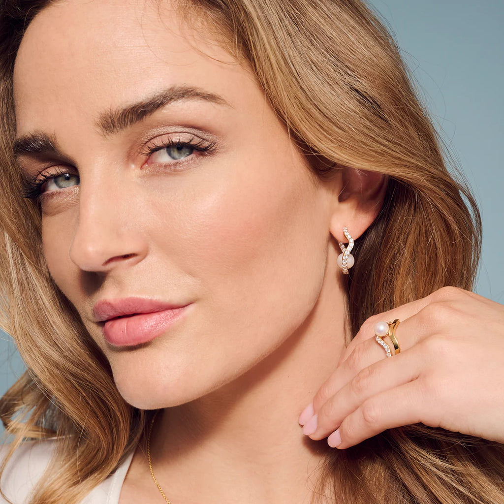 Earrings made of 925 Sterling silver with rhodium, polished surface, handset with facet cut white zirconia and lustrous freshwater pearl.