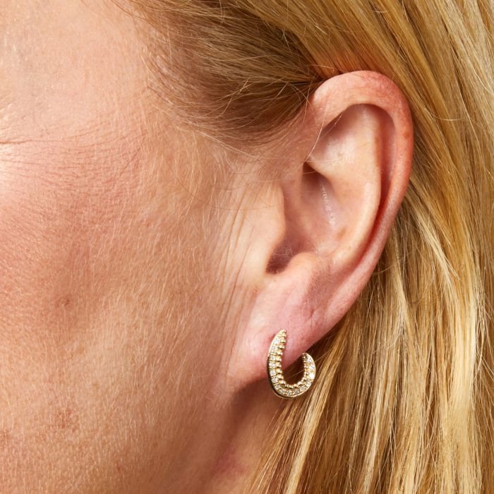 Crafted with meticulous attention to detail in 9ct yellow gold, these stud earrings boast a mesmerising half swirl design, reminiscent of the fluid curves found in modernist architecture. Adorning the centre of the elegant swirl are dazzling diamonds, evoking the glimmering allure of contemporary structures reflecting sunlight whilst delicate stippling graces the inner edge of the swirl, enhancing the textural intrigue and creating a striking contrast against the diamonds. Embrace the fusion of artistry and grace by also pairing these earrings with the matching pendant.