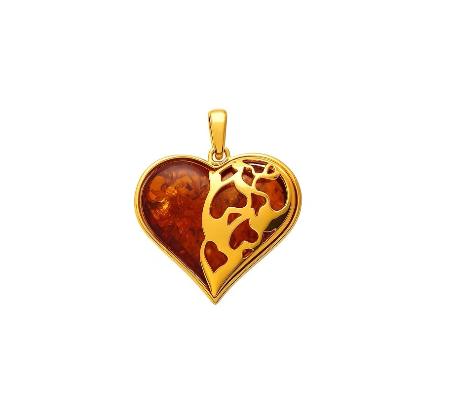 Gold plated heart shaped pendant made of a sterling silver with an oval shaped amber stone.