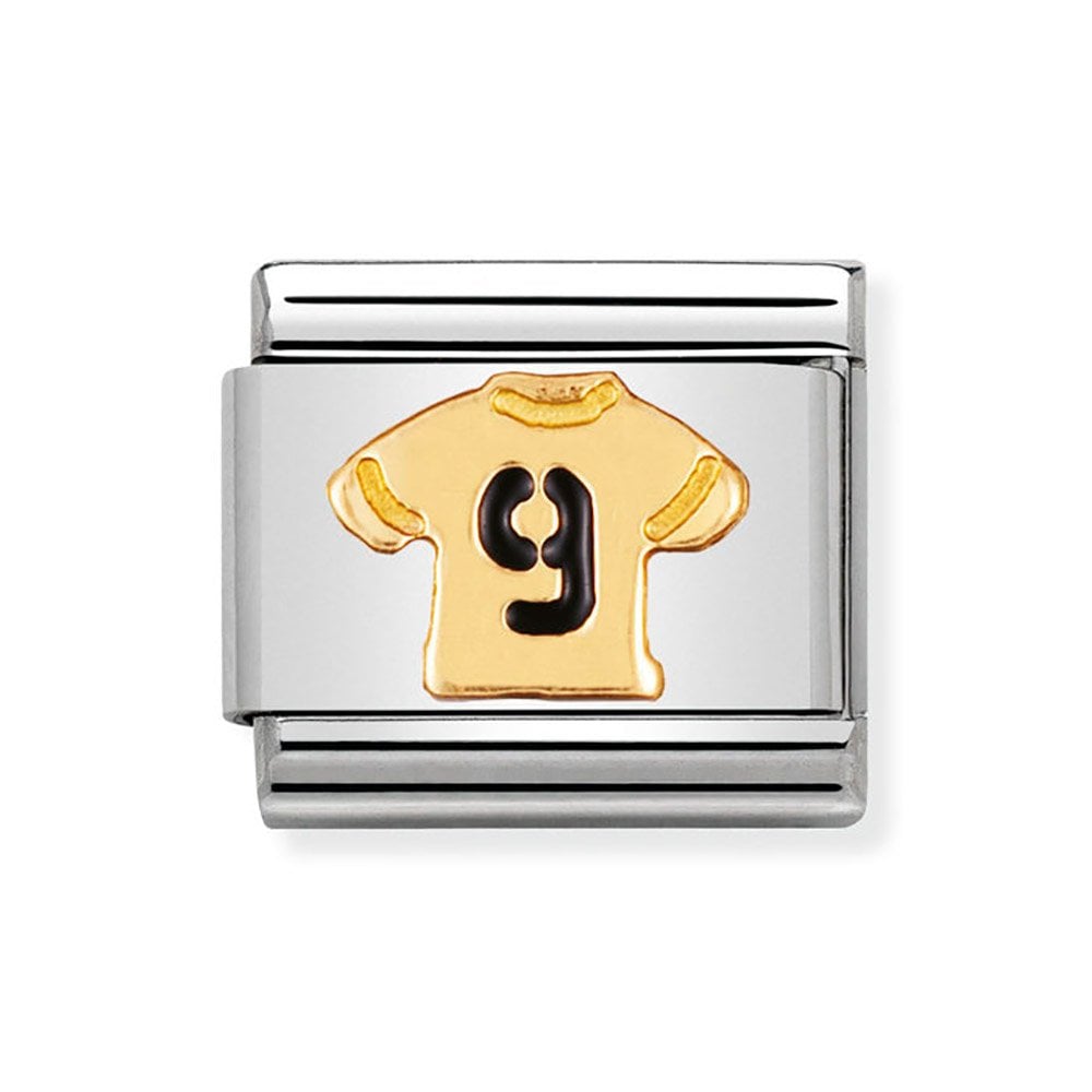This Nomination charm, crafted from stainless steel with gold and enamel detailing, features a distinctive number 9 shirt, serving as a symbolic representation for something personal to you.