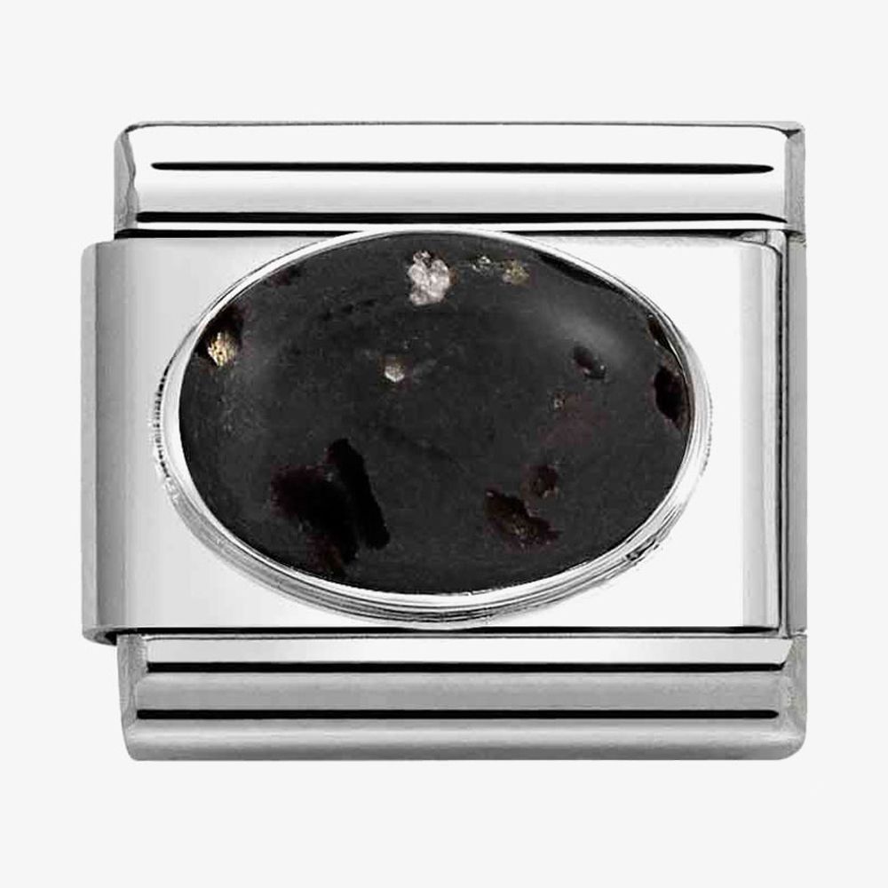 The Nomination Hard Stone charm is crafted from a stainless-steel base featuring a sterling silver plate with an oval black lava bead stone, its porous surface and dark hue reminiscent of volcanic strength. Lava stone is revered for its grounding properties and connection to the Earth, making this charm a symbol of resilience and stability.