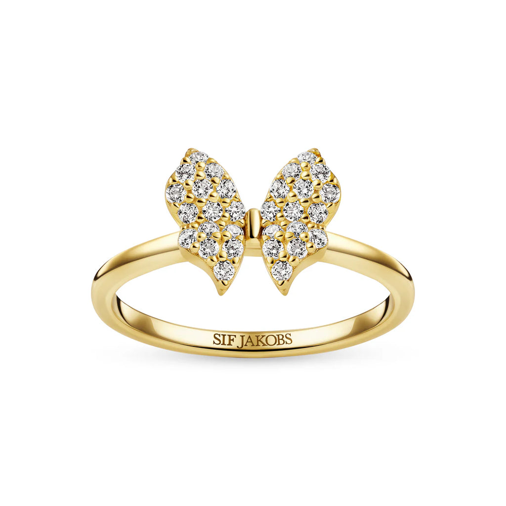 Ring made of 18 karat gold plated 925 Sterling Silver, a polished surface, and handset with facet cut white zirconia.