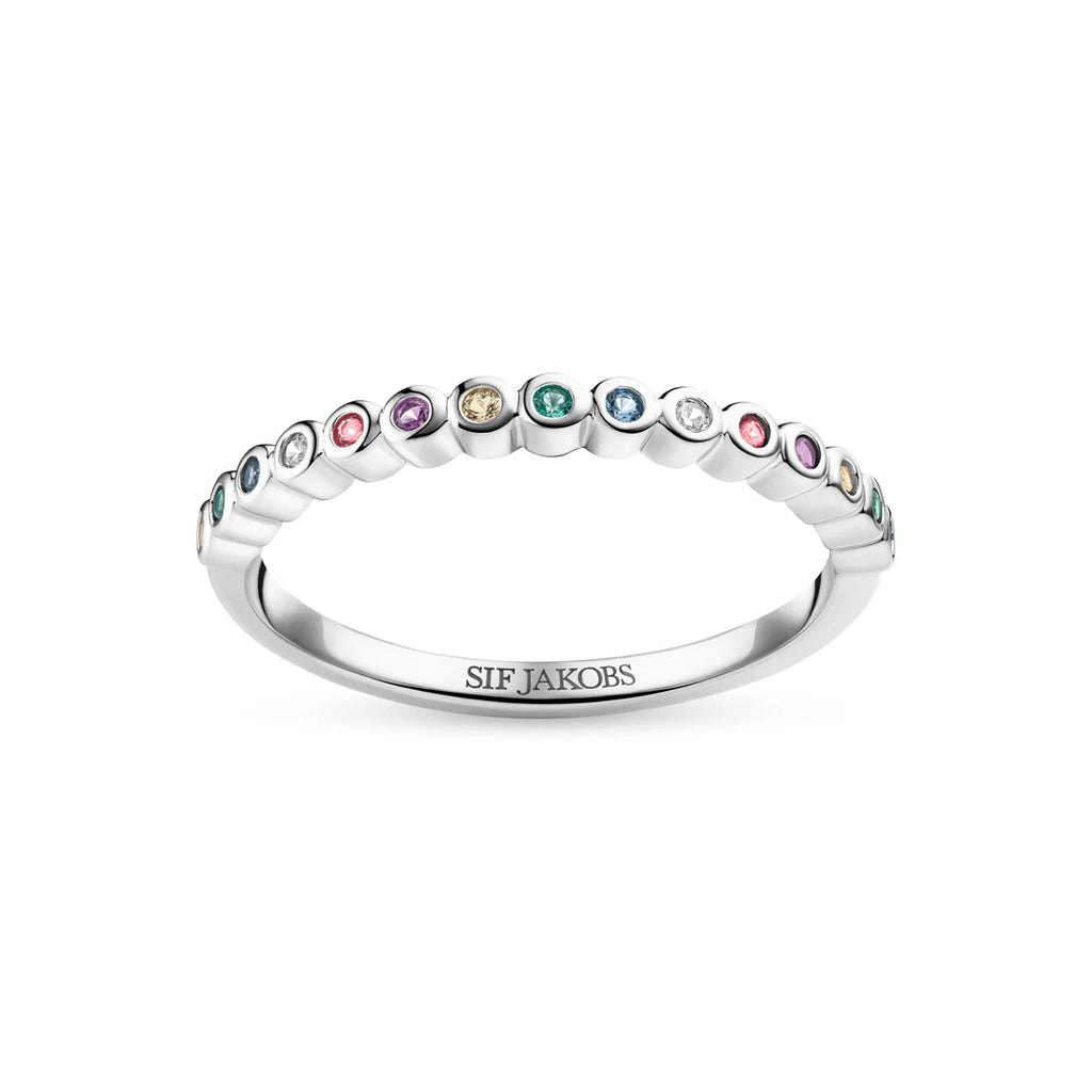 Ring made of rhodium plated 925 Sterling Silver, a polished surface, and handset with facet cut multicoloured zirconia.
