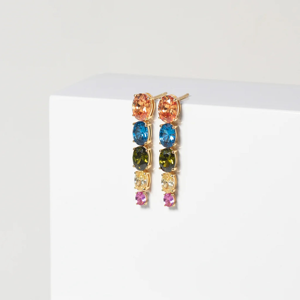 Earrings made of 18 karat gold plated 925 Sterling Silver, polished surface, and handset with facet cut multicoloured zirconia.