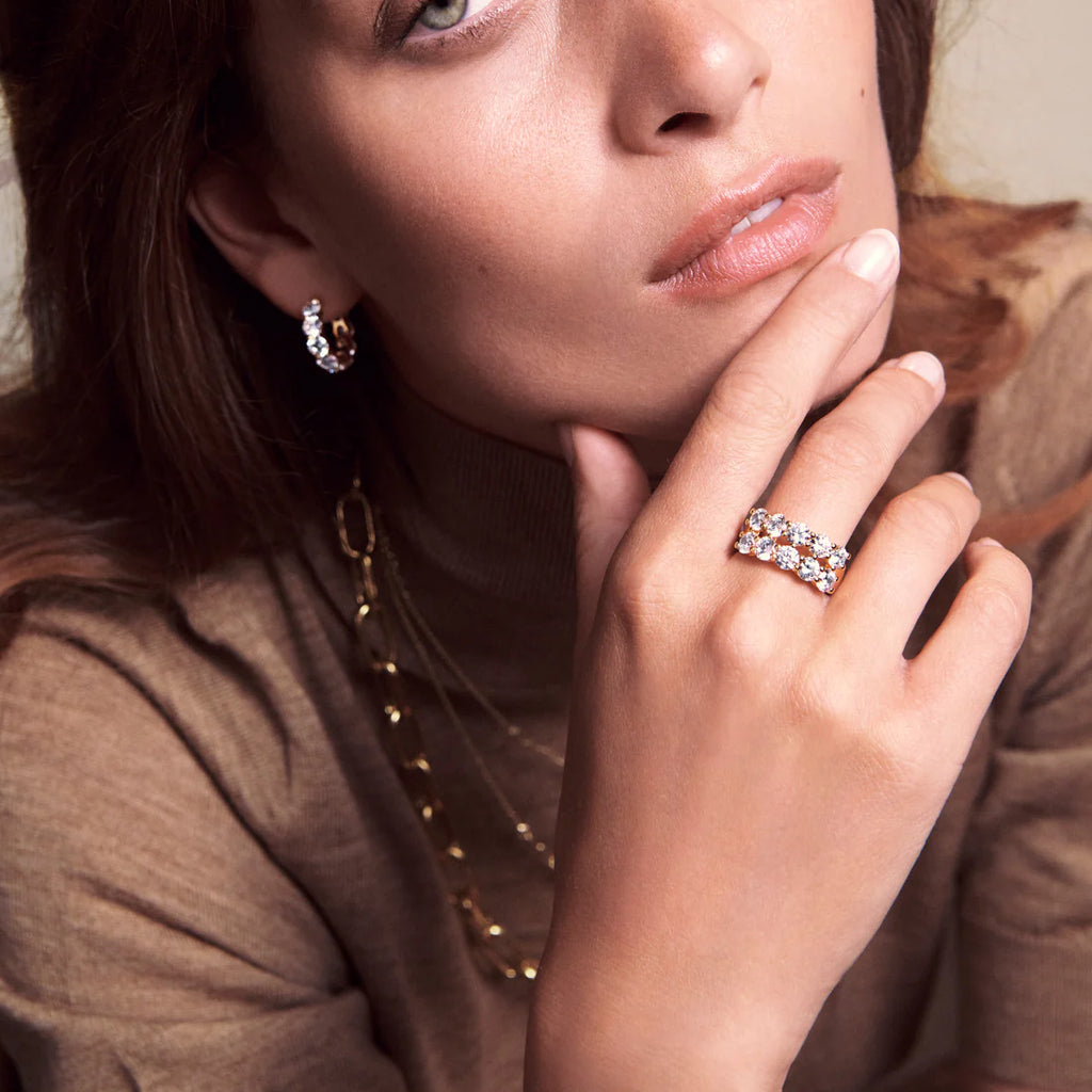 Ring made of 18 karat gold plated 925 Sterling silver, polished surface with facet cut white zirconia.