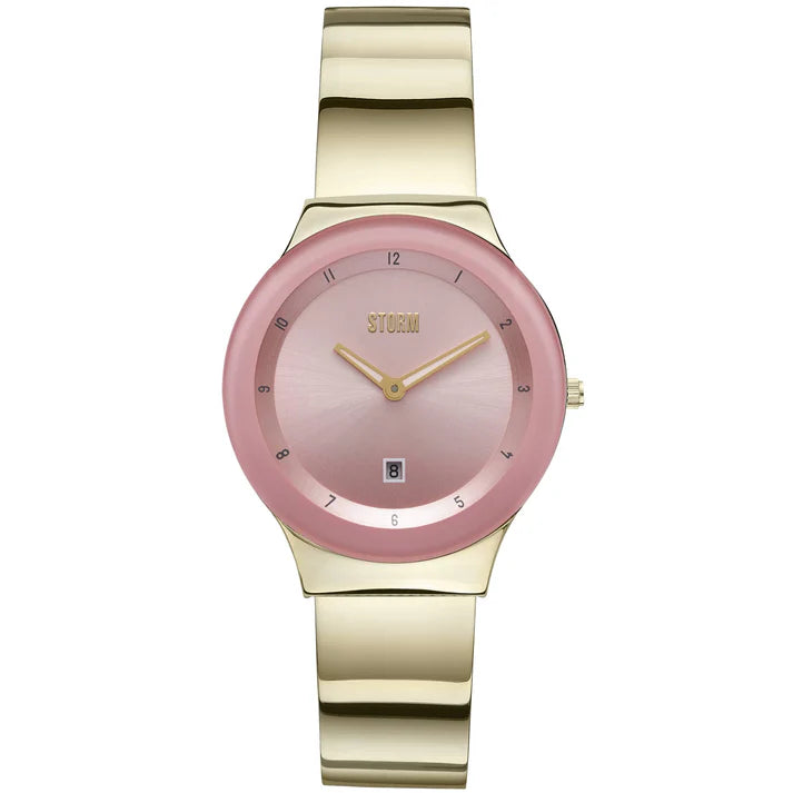 The STORM Lucki in 21k gold plating is sleek sophistication with a bold twist. Its ultra-slim, edge-to-edge design showcases a striking pink sunray dial paired with a polished semi-bangle strap. Perfect for everyday wear, this striking timepiece blends modern elegance with practicality, featuring a date display and statement-making shine.