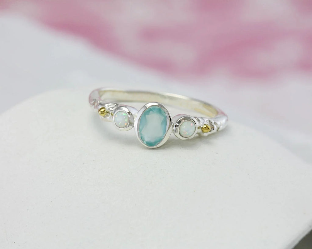 A faceted Aqua Chalcedony is nestled between two White Opals in this dainty Sterling Silver ring, complemented with Banyan's signature Brass pips.