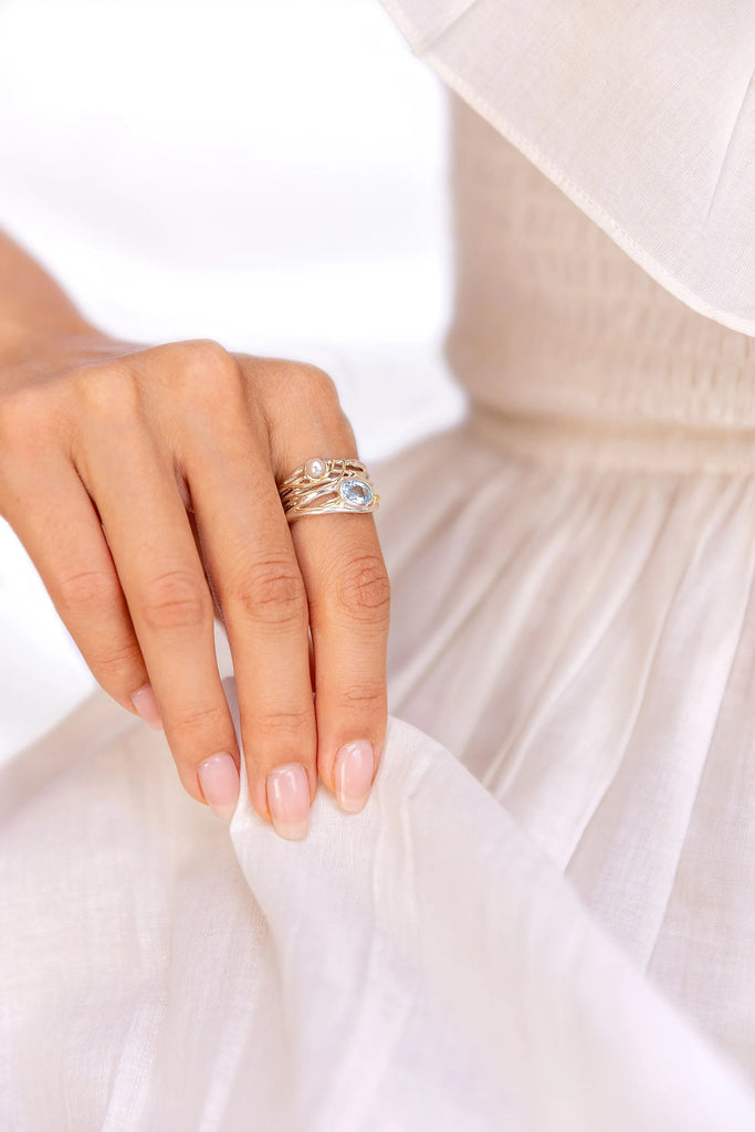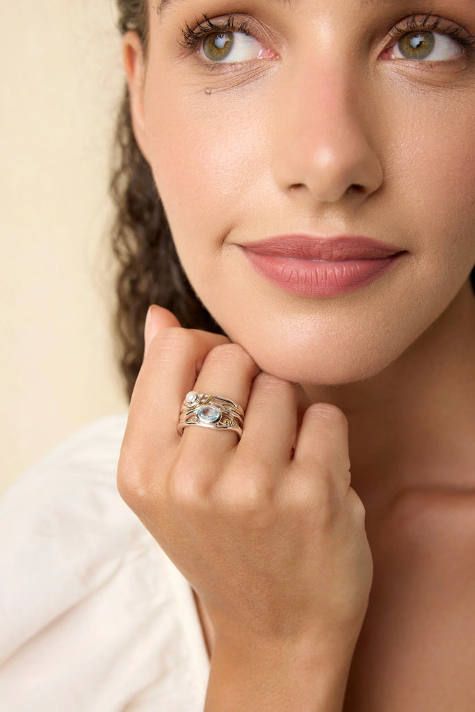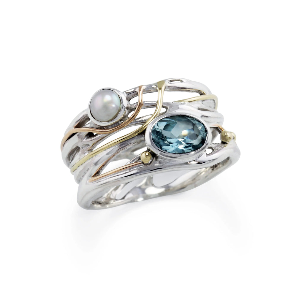 This statement ring features a sparkling faceted Blue Topaz, alongside a Freshwater Pearl. Both are set on a bed of flowing Sterling Silver with interwoven 14KT Gold detailing and Brass pips.