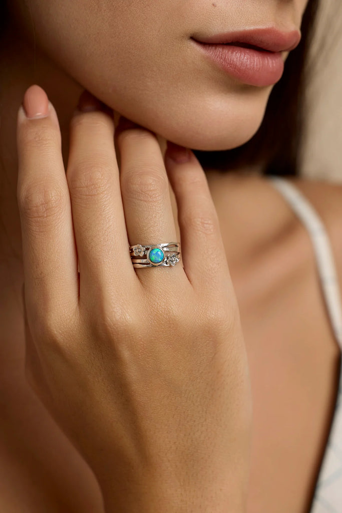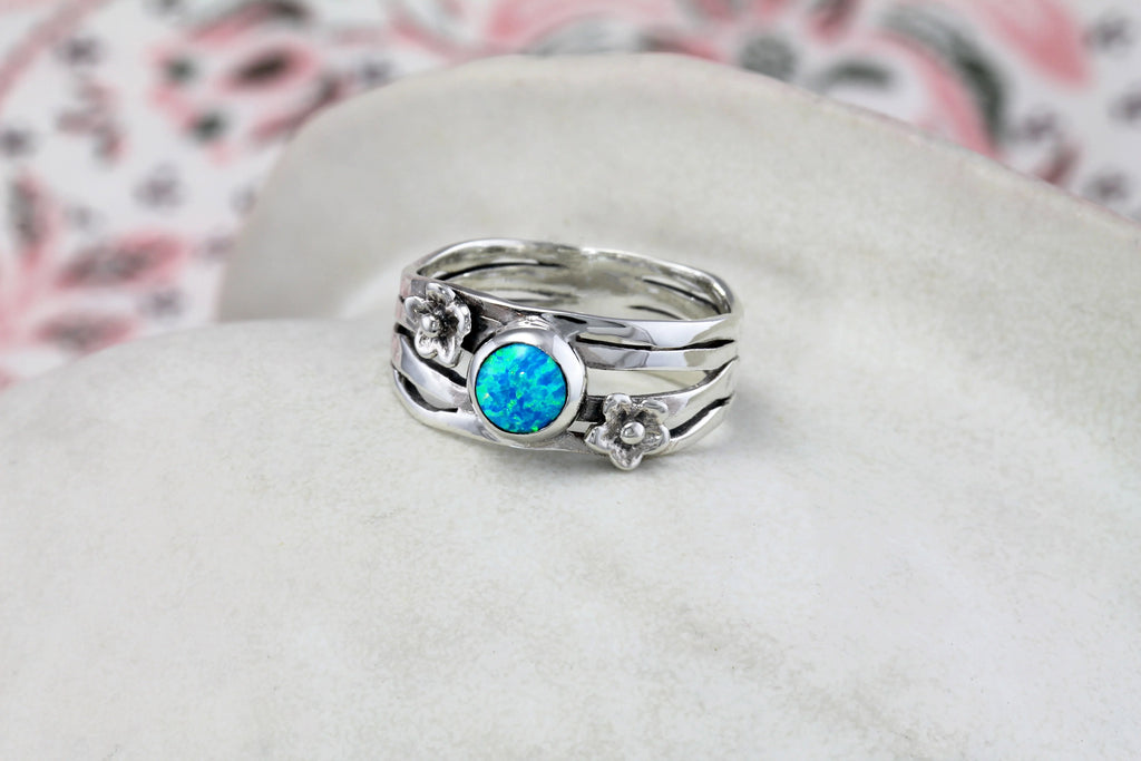 This multi-banded Sterling Silver ring features a vibrant Blue Opalite and two dainty Silver flowers.