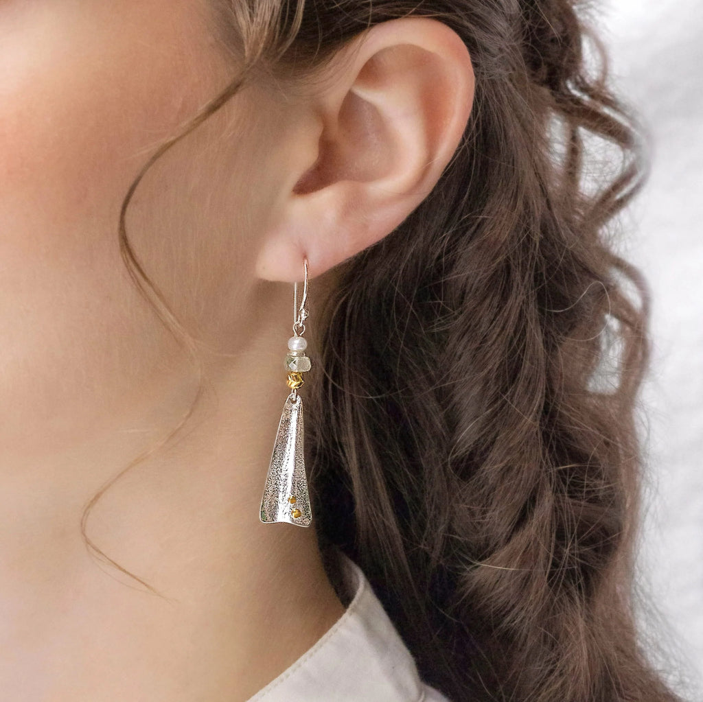 These Sterling Silver drop earrings feature Prehnite, Pearl and 14KT Gold Plated detailing. They're a fresh, contemporary design.
