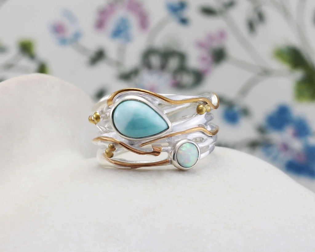 This eye-catching Sterling Silver ring set with beautiful cabochon teardrop Larimar stone, surrounded by 14kt Gold fill wire and enhanced with a round white Opalite.